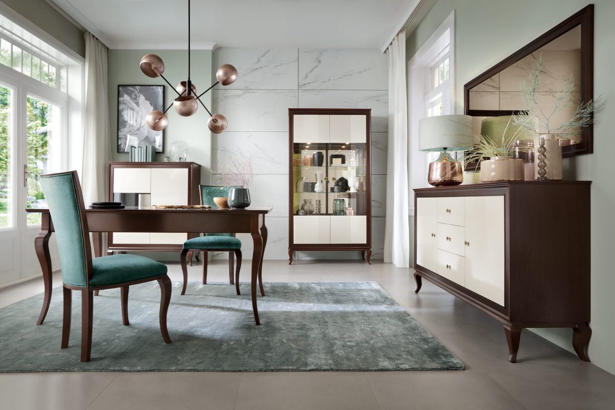 Kolekcja Nicea jest doskonałym połączeniem naturalnej okleiny w kolorze brązu i kontrastujących jasnych frontów. Dzięki delikatnym, smukłym nóżkom , całość nabiera oryginalnego charakteru a uchwyty w kształcie złotych rozet dopełniają całości. Zaprojektowana z myślą o przestronnych, zarówno nowoczesnych jak i klasycznych wnętrzach.